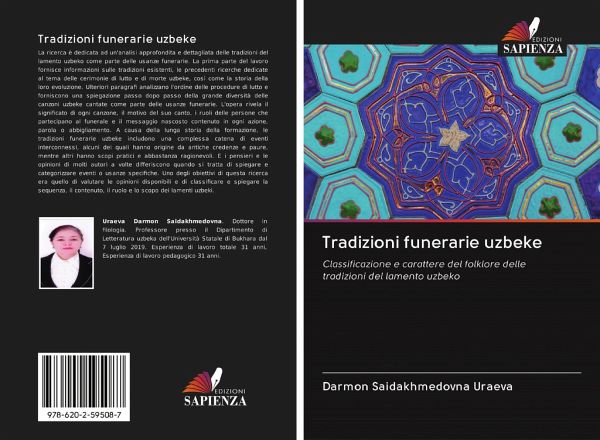 La ricerca è dedicata ad un'analisi approfondita e dettagliata delle tradizioni del lamento uzbeko come parte delle usanze funerarie. La prima parte del lavoro fornisce informazioni sulle tradizioni esistenti, le precedenti ricerche dedicate al tema delle cerimonie di lutto e di morte uzbeke, così come la storia della loro evoluzione. Ulteriori paragrafi analizzano l'ordine delle procedure di lutto e forniscono una spiegazione passo dopo passo della grande diversità delle canzoni uzbeke cantate come parte delle usanze funerarie. L'opera rivela il significato di ogni canzone, il motivo del suo canto, i ruoli delle persone che partecipano al funerale e il messaggio nascosto contenuto in ogni azione, parola o abbigliamento. A causa della lunga storia della formazione, le tradizioni funerarie uzbeke includono una complessa catena di eventi interconnessi, alcuni dei quali hanno origine da antiche credenze e paure, mentre altri hanno scopi pratici e abbastanza ragionevoli. E i pensieri e le opinioni di molti autori a volte differiscono quando si tratta di spiegare e categorizzare eventi o usanze specifiche. Uno degli obiettivi di questa ricerca era quello di valutare le opinioni disponibili e di classificare e spiegare la sequenza, il contenuto, il ruolo e lo scopo dei lamenti uzbeki.