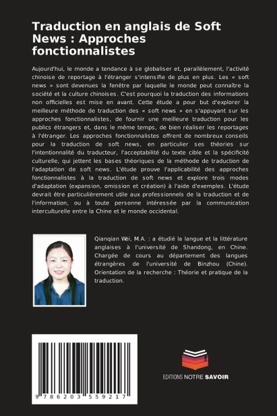 Aujourd'hui, le monde a tendance à se globaliser et, parallèlement, l'activité chinoise de reportage à l'étranger s'intensifie de plus en plus. Les « soft news » sont devenues la fenêtre par laquelle le monde peut connaître la société et la culture chinoises. C'est pourquoi la traduction des informations non officielles est mise en avant. Cette étude a pour but d'explorer la meilleure méthode de traduction des « soft news » en s'appuyant sur les approches fonctionnalistes, de fournir une meilleure traduction pour les publics étrangers et, dans le même temps, de bien réaliser les reportages à l'étranger. Les approches fonctionnalistes offrent de nombreux conseils pour la traduction de soft news, en particulier ses théories sur l'intentionnalité du traducteur, l'acceptabilité du texte cible et la spécificité culturelle, qui jettent les bases théoriques de la méthode de traduction de l'adaptation de soft news. L'étude prouve l'applicabilité des approches fonctionnalistes à la traduction de soft news et explore trois modes d'adaptation (expansion, omission et création) à l'aide d'exemples. L'étude devrait être particulièrement utile aux professionnels de la traduction et de l'information, ou à toute personne intéressée par la communication interculturelle entre la Chine et le monde occidental.