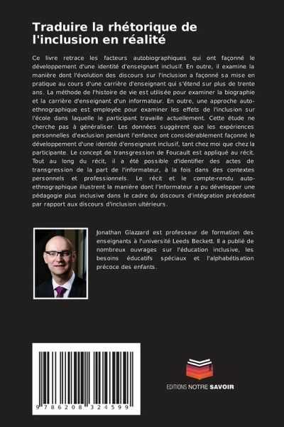 Ce livre retrace les facteurs autobiographiques qui ont façonné le développement d'une identité d'enseignant inclusif. En outre, il examine la manière dont l'évolution des discours sur l'inclusion a façonné sa mise en pratique au cours d'une carrière d'enseignant qui s'étend sur plus de trente ans. La méthode de l'histoire de vie est utilisée pour examiner la biographie et la carrière d'enseignant d'un informateur. En outre, une approche auto-ethnographique est employée pour examiner les effets de l'inclusion sur l'école dans laquelle le participant travaille actuellement. Cette étude ne cherche pas à généraliser. Les données suggèrent que les expériences personnelles d'exclusion pendant l'enfance ont considérablement façonné le développement d'une identité d'enseignant inclusif, tant chez moi que chez la participante. Le concept de transgression de Foucault est appliqué au récit. Tout au long du récit, il a été possible d'identifier des actes de transgression de la part de l'informateur, à la fois dans des contextes personnels et professionnels. Le récit et le compte-rendu auto-ethnographique illustrent la manière dont l'informateur a pu développer une pédagogie plus inclusive dans le cadre du discours d'intégration précédent par rapport aux discours d'inclusion ultérieurs.