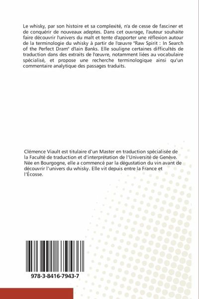 Le whisky, par son histoire et sa complexité, n'a de cesse de fasciner et de conquérir de nouveaux adeptes. Dans cet ouvrage, l'auteur souhaite faire découvrir l'univers du malt et tente d'apporter une réflexion autour de la terminologie du whisky à partir de l'oeuvre "Raw Spirit : In Search of the Perfect Dram" d'Iain Banks. Elle souligne certaines difficultés de traduction dans des extraits de l'oeuvre, notamment liées au vocabulaire spécialisé, et propose une recherche terminologique ainsi qu'un commentaire analytique des passages traduits.