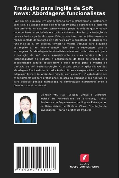 Hoje em dia, o mundo tem uma tendência para a globalização e, juntamente com isso, a atividade chinesa de reportagem para o estrangeiro é cada vez mais profunda. As soft news tornaram-se a janela através da qual o mundo pode conhecer a sociedade e a cultura chinesas. Por isso, a tradução de notícias ligeiras ganha destaque. Este estudo tem como objetivo explorar o melhor método de tradução de soft news com a orientação de abordagens funcionalistas e, em seguida, fornecer a melhor tradução para o público estrangeiro e, ao mesmo tempo, fazer bem a reportagem para o estrangeiro. As abordagens funcionalistas oferecem muita orientação para a tradução de soft news, especialmente as suas teorias sobre a intencionalidade do tradutor, a aceitabilidade do texto de chegada e a especificidade cultural estabelecem a base teórica para o método de tradução de soft news-adaptação. O estudo prova a aplicabilidade das abordagens funcionalistas à tradução de soft news e explora três modos de adaptação (expansão, omissão e criação) com exemplos. O estudo deve ser especialmente útil para profissionais da área da tradução e das notícias, ou para qualquer pessoa interessada na comunicação intercultural entre a China e o mundo ocidental.