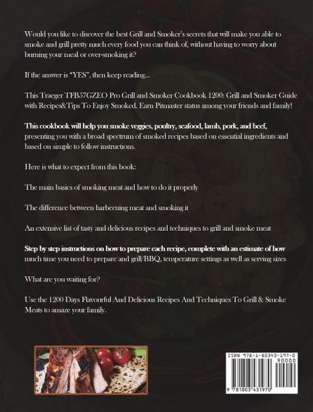 Would you like to discover the best Grill and Smoker's secrets that will make you able to smoke and grill pretty much every food you can think of, without having to worry about burning your meal or over-smoking it? If the answer is "YES", then keep reading... This Traeger TFB57GZEO Pro Grill and Smoker Cookbook 1200: Grill and Smoker Guide with Recipes&Tips To Enjoy Smoked. Earn Pitmaster status among your friends and family! This cookbook will help you smoke veggies, poultry, seafood, lamb, pork, and beef, presenting you with a broad spectrum of smoked recipes based on essential ingredients and based on simple to follow instructions. Here is what to expect from this book: The main basics of smoking meat and how to do it properly The difference between barbecuing meat and smoking it An extensive list of tasty and delicious recipes and techniques to grill and smoke meat Step by step instructions on how to prepare each recipe, complete with an estimate of how much time you need to prepare and grill/BBQ, temperature settings as well as serving sizes What are you waiting for? Use the 1200 Days Flavourful And Delicious Recipes And Techniques To Grill & Smoke Meats to amaze your family.