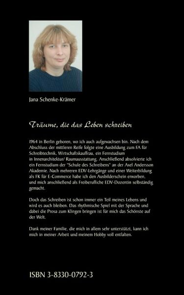 Jana Schenke-Krämer 1964 in Berlin geboren und aufgewachsen. Nach dem Schulabschluss folgte eine Ausbildung zum FA für Schreibtechnik, Wirtschaftskauffrau und ein Fernstudium Innenarchitektur /Raumausstattung. Durch die Liebe zum Schreiben absolvierte ich die "Schule des Schreibens" an der AAA in Hamburg, um meinen persönlichen Stil zu festigen. Nach mehreren EDV-Lehrgängen und einer Weiterbildung als FK frü E-Commerce habe ich den Ausbilderschein erworben und mich anschließend als Freiberufliche EDV-Dozentin selbständig gemacht.Die Liebe zum Schreiben hat mich dazu bewegt, einen Kleinverlag zu gründen, um anderen Autoren eine Chance zur Veröffentlichung zu bieten. Dank meiner Familie, einem Mann und unserer drei Söhne, kann ich mich in der Arbeit (EDV) und dem Hobby (Schreiben) voll entfalten.