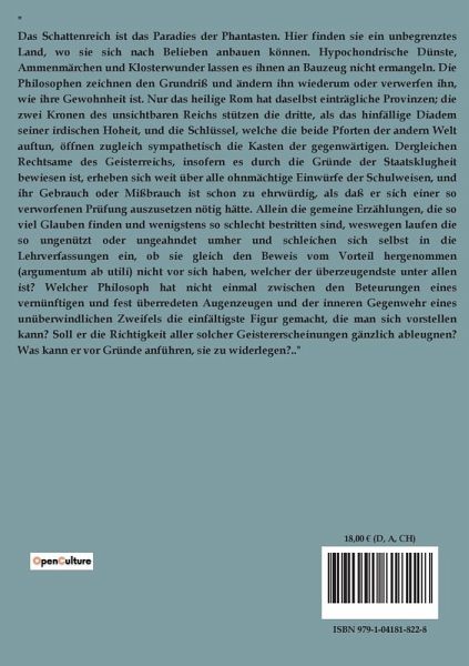 " Das Schattenreich ist das Paradies der Phantasten. Hier finden sie ein unbegrenztes Land, wo sie sich nach Belieben anbauen können. Hypochondrische Dünste, Ammenmärchen und Klosterwunder lassen es ihnen an Bauzeug nicht ermangeln. Die Philosophen zeichnen den Grundriß und ändern ihn wiederum oder verwerfen ihn, wie ihre Gewohnheit ist. Nur das heilige Rom hat daselbst einträgliche Provinzen; die zwei Kronen des unsichtbaren Reichs stützen die dritte, als das hinfällige Diadem seiner irdischen Hoheit, und die Schlüssel, welche die beide Pforten der andern Welt auftun, öffnen zugleich sympathetisch die Kasten der gegenwärtigen. Dergleichen Rechtsame des Geisterreichs, insofern es durch die Gründe der Staatsklugheit bewiesen ist, erheben sich weit über alle ohnmächtige Einwürfe der Schulweisen, und ihr Gebrauch oder Mißbrauch ist schon zu ehrwürdig, als daß er sich einer so verworfenen Prüfung auszusetzen nötig hätte. Allein die gemeine Erzählungen, die so viel Glauben finden und wenigstens so schlecht bestritten sind, weswegen laufen die so ungenützt oder ungeahndet umher und schleichen sich selbst in die Lehrverfassungen ein, ob sie gleich den Beweis vom Vorteil hergenommen (argumentum ab utili) nicht vor sich haben, welcher der überzeugendste unter allen ist? Welcher Philosoph hat nicht einmal zwischen den Beteurungen eines vernünftigen und fest überredeten Augenzeugen und der inneren Gegenwehr eines unüberwindlichen Zweifels die einfältigste Figur gemacht, die man sich vorstellen kann? Soll er die Richtigkeit aller solcher Geistererscheinungen gänzlich ableugnen? Was kann er vor Gründe anführen, sie zu widerlegen?.."