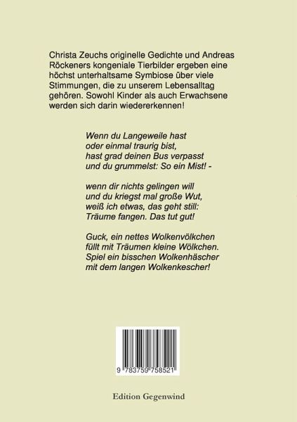 Christa Zeuchs originelle Gedichte und Andreas Röckeners kongeniale Tierbilder ergeben eine höchst unterhaltsame Symbiose über viele Stimmungen, die zu unserem Lebensalltag gehören. Sowohl Kinder als auch Erwachsene werden sich darin wiedererkennen!Wenn du Langeweile hastoder einmal traurig bist,hast grad deinen Bus verpasstund du grummelst: So ein Mist! -wenn dir nichts gelingen willund du kriegst mal große Wut,weiß ich etwas, das geht still:Träume fangen. Das tut gut!Guck, ein nettes Wolkenvölkchenfüllt mit Träumen kleine Wölkchen.Spiel ein bisschen Wolkenhäschermit dem langen Wolkenkescher!
