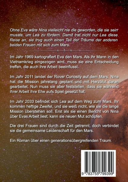 Ohne Eva wäre Nina vielleicht nie die geworden, die sie sein musste, um Lea zu fördern. Damit trat nicht nur Lea diese Reise an, sie trug auch einen Teil der Träume der anderen beiden Frauen mit sich zum Mars.Im Jahr 1969 kartografiert Eva den Mars. Als ihr Mann in den Vietnamkrieg eingezogen wird, muss sie eine Entscheidung treffen, die auch ihre Arbeit beeinflusst.Im Jahr 2011 landet der Rover Curiosity auf dem Mars. Nina hat die Mission jahrelang geplant und mit Herzblut daran gearbeitet. Nun muss sie aber feststellen, dass sie während ihrer Arbeit ihre Ehe aufs Spiel gesetzt hat.Im Jahr 2033 befindet sich Lea auf dem Weg zum Mars. Als ihr heftige Zweifel kommen, weiß sie nicht mehr, wie sie die lange Mission überstehen soll. Erst als sie einen Bericht von Nina über Evas Arbeit liest, kann sie neuen Mut schöpfen. Die drei Frauen sind durch die Zeit getrennt, doch verbindet sie die gemeinsame Leidenschaft für den Mars.Ein Roman über einen generationsübergreifenden Traum.