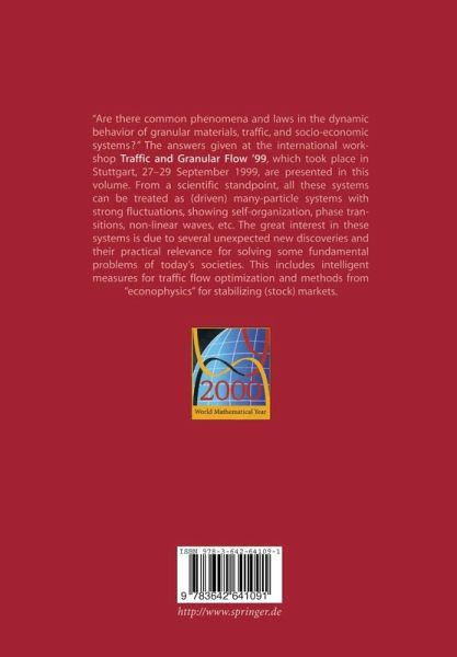 Foreword.- Preface.- List of Participants.- Social Dynamics.- Recurrence in Physical and Social Systems.- Econophysics: What Can Physicists Contribute to Economics?.- Catastrophe Effects and Optimal Extensions of Transportation Flows in the Developing Urban System: A Review.- Evolutionary Models of Innovation Dynamics.- Universality of Group Decision Making.- Formation of Opinions under the Influence of Competing Agents -a Mean Field Approach.- Search for Intelligence by Motion Analysis ;-).- Anticipatory Traffic Forecast Using Multi-Agent Techniques.- Modal Split and Social Dilemmas.- Synthetising Brillouin Information-Thermodynamic Approach with the Social Synergetics Weidlich-Haag Model.- Biology, Internet, Transport Theory.- Evolution of Molecular Phenotypes - A Physicist's View of Darwin's Principle.- Stochastic Resonance and Brownian Machinery: New Results -New Applications - New Goals.- Studies of Bacterial Cooperative Organization.- Collective Motion and Optimal Self-Organisation in Self-Driven Systems.- Active Brownian Particles with Internal Energy Depot.- Associative Memory of a Pulse-Coupled Noisy Neural Network with Delays: The Lighthouse Model.- Application of Neural Networks for Predictive and Control Purposes.- Optimizing Traffic in Virtual and Real Space.- Is Boltzmann's Equation Physically Insufficient?.- Fractional Evolution Equations and Irreversibility.- Dynamical Theory of Steady State Selection in Open Driven Diffusive Systems.- Application of a Deterministic Scheme for the Boltzmann Equation in Modelling Shock Wave Focusing.- Nonlinear Waves and Moving Clusters on Rings.- Freezing by Heating in a Pedestrian Model.- Traffic Data and Applications.- Phase Transitions in Traffic Flow.- An Integrated Model of Transport and Urban Evolution (ITEM)-Traffic and City Development in Emergent Nations.- Statistical Analysis of Freeway Traffic.- Nonlinear Control of Stop-and-Go Traffic.- Online Simulation and State Estimation for a Traffic Flow Model.- Traffic News by Dynamic Fuzzy Classification.- Evaluation of Single Vehicle Data in Dependence of the Vehicle-Type, Lane, and Site.- Forecasting of Traffic Congestion.- Empirical Phase Diagram of Traffic Flow on Highways with On-Ramp.- On-Line Simulation of the Freeway Network of North Rhine-Westphalia.- Traffic Data Collection Using Image Processing Technology.- Modelling of Traffic Flow.- Microscopic Simulation of Congested Traffic.- Order Parameter as an Additional State Variable of Unstable Traffic Flow.- Macroscopic Simulation of Open Systems and Micro-Macro Link.- Relating Car-Following and Continuum Models of Road Traffic.- Microscopic Randomness in Foliow-the-Leader Dynamics.- "Car-SPH": A Lagrangian Particle Scheme for the Solution of the Macroscopic Traffic Flow Equations.- An Exactly Solvable Two-Way Traffic Model with Ordered Sequential Update.- Exact Traveling Cluster Solutions of Differential Equations with Delay for a Traffic Flow Model.- Stable and Metastable States in Congested Traffic.- Detailed Microscopic Rules to Simulate Multilane Freeway Traffic.- CA Models for Traffic Flow: Comparison with Empirical Single-Vehicle Data.- A New Cellular Automata Model for City Traffic.- Stochastic Boundary Conditions in the Nagel-Schreckenberg Traffic Model.- A Stochastic Multi-Cluster Model of Freeway Traffic.- Granular Dynamics.- Jamming Patterns and Blockade Statistics in Model Granular Flows.- Kinetics of Granular Gases.- Particle Segregation in the Context of the Species Momentum Balances.- Avalanche Parameters: Dependence on the Size of the GranularPacking.- Ripple Formation in a Saltation-Avalanche Model.- Particle Diffusion and Segregation in Rotating Cylinders.- Molecular Dynamics Simulation of Cohesive Granular Materials.- A Model for Slowly Moving Granular Matter.- Pressure Distribution of a Two-Dimensional Sandpile.