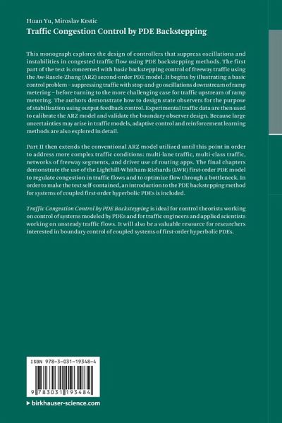 Traffic Congestion Control by PDE Backstepping is ideal for control theorists working on control of systems modeled by PDEs and for traffic engineers and applied scientists working on unsteady traffic flows. It will also be a valuable resource for researchers interested in boundary control of coupled systems of first-order hyperbolic PDEs.