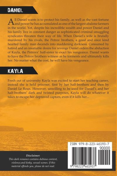DANIEL All Daniel wants is to protect his family, as well as the vast fortune and power he has accumulated as one of the largest abalone farmers in the world. Yet, despite his incredible wealth and power Daniel and his family live in constant danger as sophisticated criminal smuggling syndicates threaten their way of life. When Daniel's wife is brutally murdered by his rivals, the Petrov brothers, a good and once kind hearted family man decends into maddening darkness. Consumed by hatred and an insatiable desire for revenge Daniel orders the abduction of Kayla, the Petrovs' half-sister to exact his vengeance. Daniel wants to have the Petrov brothers witness as he torments and ultimately kills her. No matter what the cost, he will have his vengeance. KAYLA Fresh out of university Kayla was excited to start her teaching career, instead she is held prisoner, first by her half-brothers and then by Daniel Le Roux. However, unwilling to be used for Daniel's and her half-brothers' dark and twisted purposes, Kayla will do whatever it takes to escape her depraved captors, even if it kills her... Disclaimer: This dark romance contains dubious content, violence,and kinky, sexual scenes. If this material offends you, please do not read.