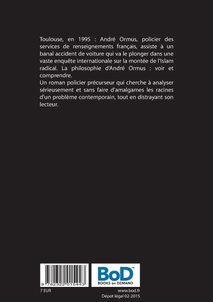 Toulouse, en 1995 : André Ormus, policier des services de renseignements français, assiste à un banal accident de voiture qui va le plonger dans une vaste enquête internationale sur la montée de l'Islam radical. La philosophie d'André Ormus : voir et comprendre.Un roman policier précurseur qui cherche à analyser sérieusement et sans faire d'amalgames les racines d'un problème contemporain, tout en distrayant son lecteur.