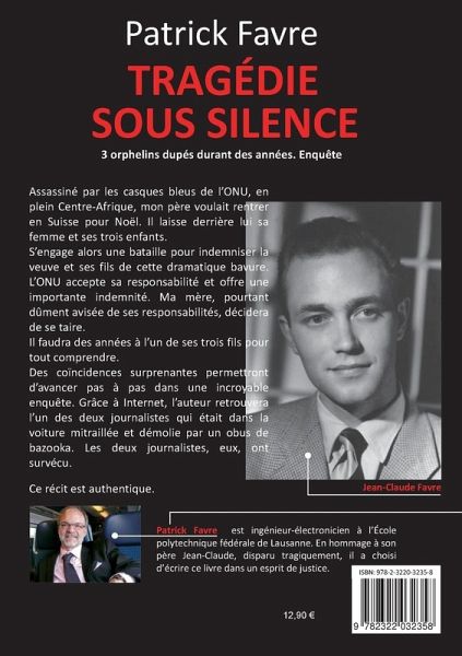 Assassiné par les casques bleus de l ONU, en plein Centre-Afrique, mon père voulait rentrer en Suisse pour Noël. Il laisse derrière lui sa femme et ses trois enfants.S engage alors une bataille pour indemniser la veuve et ses fils de cette dramatique bavure. L ONU accepte sa responsabilité et offre une importante indemnité. Ma mère, pourtant dûment avisée de ses responsabilités, décidera de se taire.Il faudra des années à l un de ses trois fils pour tout comprendre.Des coïncidences surprenantes permettront d avancer pas à pas dans une incroyable enquête. Grâce à Internet, l auteur retrouvera l un des deux journalistes qui était dans la voiture mitraillée et démolie par un obus de bazooka. Les deux journalistes, eux, ont survécu.Ce récit est authentique.