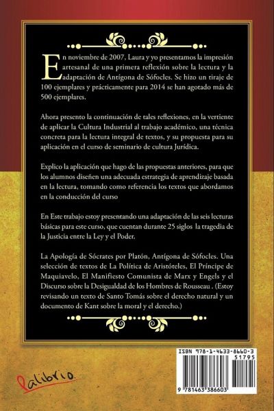 En noviembre de 2007, Laura y yo presentamos la impresión artesanal de una primera reflexión sobre la lectura y la adaptación de Antígona de Sófocles. Se hizo un tiraje de 100 ejemplares y prácticamente para 2014 se han agotado más de 500 ejemplares. Ahora presento la continuación de tales reflexiones, en la vertiente de aplicar la Cultura Industrial al trabajo académico, una técnica concreta para la lectura integral de textos, y su propuesta para su aplicación en el curso de seminario de cultura Jurídica. Explico la aplicación que hago de las propuestas anteriores, para que los alumnos diseñen una adecuada estrategia de aprendizaje basada en la lectura, tomando como referencia los textos que abordamos en la conducción del curso En Este trabajo estoy presentando una adaptación de las seis lecturas básicas para este curso, que cuentan durante 25 siglos la tragedia de la Justicia entre la Ley y el Poder. La Apología de Sócrates por Platón, Antígona de Sófocles. Una selección de textos de La Política de Aristóteles, El Príncipe de Maquiavelo, El Manifiesto Comunista de Marx y Engels y el Discurso sobre la Desigualdad de los Hombres de Rousseau . (Estoy revisando un texto de Santo Tomás sobre el derecho natural y un documento de Kant sobre la moral y el derecho.)