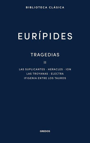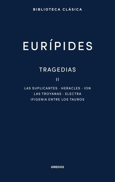 Eurípides es el más inquieto y apasionado de los tres grandes autores trágicos griegos. Seguramente también es el más influyente, gracias a su sensibilidad poética, más cercana a la actual. A diferencia de Esquilo y Sófocles, que le precedieron, Eurípides humaniza y dota de carácter realista al mito, da rienda suelta a los arrebatos poéticos, a la vez que también se muestra muy racionalista. En este contraste contradictorio radica parte de su encanto y de su modernidad. El segundo tomo de las tragedias completas de Eurípides en la Biblioteca Clásica reúne las obras: Las suplicantes, Heracles, Ion, Las troyanas, Electra e Ifigenia entre los tauros .