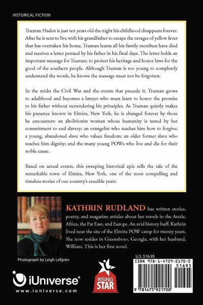 Truman Haden is just ten years old the night his childhood disappears forever. After he is sent to live with his grandfather to escape the ravages of yellow fever that has overtaken his home, Truman learns all his family members have died and receives a letter penned by his father in his final days. The letter holds an important message for Truman: to protect his heritage and honor laws for the good of the southern people. Although Truman is too young to completely understand the words, he knows the message must not be forgotten. In the midst the Civil War and the events that precede it, Truman grows to adulthood and becomes a lawyer who must learn to honor the promise to his father without surrendering his principles. As Truman quietly makes his presence known in Elmira, New York, he is changed forever by those he encounters: an abolitionist woman whose humanity is tested by her commitment to end slavery; an evangelist who teaches him how to forgive; a young, abandoned slave who values freedom; an older former slave who teaches him dignity; and the many young POWs who live and die for their noble cause. Based on actual events, this sweeping historical epic tells the tale of the remarkable town of Elmira, New York, one of the most compelling and timeless stories of our country's crucible years.