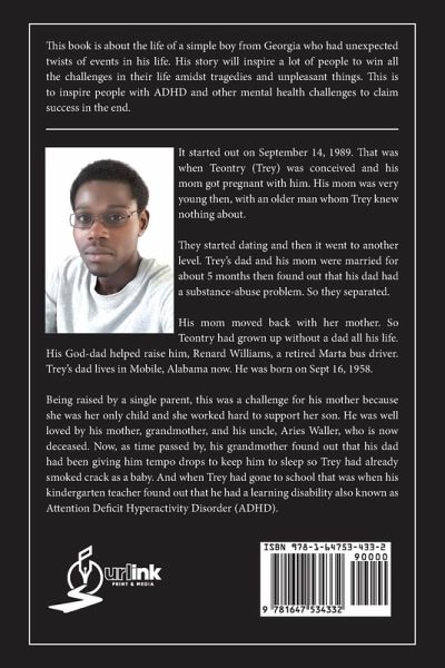 This book is about the life of a simple boy from Georgia who had unexpected twists of events in his life. His story will inspire a lot of people to win all the challenges in their life amidst tragedies and unpleasant things. This is to inspire people with ADHD and other mental health challenges to claim success in the end. It started out on September 14, 1989. That was when Teontry (Trey) was conceived and his mom got pregnant with him. His mom was very young then, with an older man whom Trey knew nothing about. They started dating and then it went to another level. Trey's dad and his mom were married for about 5 months then found out that his dad had a substance-abuse problem. So they separated. His mom moved back with her mother. So Teontry had grown up without a dad all his life. His God-dad helped raise him, Renard Williams, a retired Marta bus driver. Trey's dad lives in Mobile, Alabama now. He was born on Sept 16, 1958. Being raised by a single parent, this was a challenge for his mother because she was her only child and she worked hard to support her son. He was well loved by his mother, grandmother, and his uncle, Aries Waller, who is now deceased. Now, as time passed by, his grandmother found out that his dad had been giving him tempo drops to keep him to sleep so Trey had already smoked crack as a baby. And when Trey had gone to school that was when his kindergarten teacher found out that he had a learning disability also known as Attention Deficit Hyperactivity Disorder (ADHD).