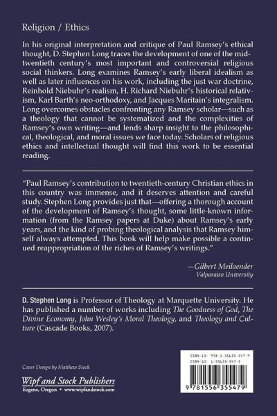 In his original interpretation and critique of Paul Ramsey's ethical thought, D. Stephen Long traces the development of one of the mid-twentieth century's most important and controversial religious social thinkers. Long examines Ramsey's early liberal idealism as well as later influences on his work, including the just war doctrine, Reinhold Niebuhr's realism, H. Richard Niebuhr's historical relativism, Karl Barth's neo-orthodoxy, and Jacques Maritain's integralism. Long overcomes obstacles confronting any Ramsey scholar--such as a theology that cannot be systematized and the complexities of Ramsey's own writing--and lends sharp insight to the philosophical, theological, and moral issues we face today. Scholars of religious ethics and intellectual thought will find this work to be essential reading.