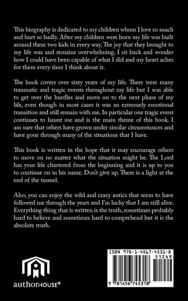 This biography is dedicated to my children whom I love so much and hurt so badly. After my children were born my life was built around these two kids in every way. The joy that they brought to my life was and remains overwhelming. I sit back and wonder how I could have been capable of what I did and my heart aches for them every time I think about it. The book covers over sixty years of my life. There were many traumatic and tragic events throughout my life but I was able to get over the hurdles and move on to the next phase of my life, even though in most cases it was an extremely emotional transition and still remain with me. In particular one tragic event continues to haunt me and is the main theme of this book. I am sure that others have grown under similar circumstances and have gone through many of the situations that I have. This book is written in the hope that it may encourage others to move on no matter what the situation might be. The Lord has your life chartered from the beginning and it is up to you to continue on in his name. Don't give up. There is a light at the end of the tunnel. Also, you can enjoy the wild and crazy antics that seem to have followed me through the years and I'm lucky that I am still alive. Everything thing that is written is the truth, sometimes probably hard to believe and sometimes hard to comprehend but it is the absolute truth.