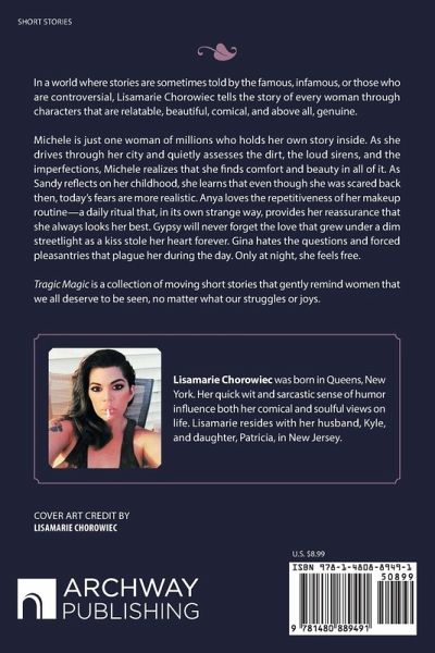 In a world where stories are sometimes told by the famous, infamous, or those who are controversial, Lisamarie Chorowiec tells the story of every woman through characters that are relatable, beautiful, comical, and above all, genuine. Michele is just one woman of millions who holds her own story inside. As she drives through her city and quietly assesses the dirt, the loud sirens, and the imperfections, Michele realizes that she finds comfort and beauty in all of it. As Sandy reflects on her childhood, she learns that even though she was scared back then, today's fears are more realistic. Anya loves the repetitiveness of her makeup routine-a daily ritual that, in its own strange way, provides her reassurance that she always looks her best. Gypsy will never forget the love that grew under a dim streetlight as a kiss stole her heart forever. Gina hates the questions and forced pleasantries that plague her during the day. Only at night, she feels free. Tragic Magic is a collection of moving short stories that gently remind women that we all deserve to be seen, no matter what our struggles or joys.
