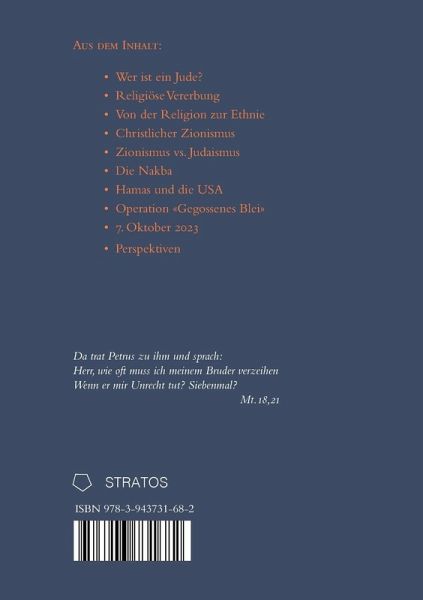 Das Buch bietet fast eine Überfülle an Informationen, die in Deutschland kaum bekannt sind. Aus der Sicht des Judaismus wird die Frage beantworte, was - im Sinne des orthodoxen Judaismus - ein Jude ist. Das Konzept der religiösen Vererbung wird erklärt ebenso wie der tragische Wandel im 19. Jahrhundert als aus Religionsgemeinschaft eine Ethnie gemacht wurde. Weitere Themen: Verschiedene Formen des Antisemitismus; die große Bewegung des christlichen Zionismus, die in Deutschland nur wenige kennen, obwohl zu ihr 200 Mio. Anhänger gehören; die Nakba; die Wurzeln des Hamas in den USA; die Operation «Gegossenes Blei». Perspektiven.