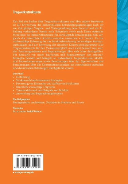 Das Ziel des Buches über Tragwerkstrukturen und über andere Strukturen ist die Erweiterung der herkömmlichen Entscheidungsgrundlagen nach der zur Zeit gültigen Vergabe- und Vertragsordnung beim Entwurf und der Erhaltung vorhandener Bauten nach Baupreisen sowie nach Daten optimaler Strukturen der Baukonstruktionen für vorzulegende Berechnungen zum Vergleich der betrachteten Strukturvarianten zusammen mit Preisen. Da die zahlenmäßige Erfassung der zur Strukturberechnung notwendigen Strukturaufbaudaten und der Bewertung der einzelnen Konstruktionsparameter aller Tragwerkselemente für den Variantenvergleich noch nicht bekannt war, wurden Forschungsarbeiten und Begutachtungen über viele Jahre durchgeführt. Für Entwürfe von neuen Bauwerken und Begutachtungen von strukturbedingten Schäden und Mängeln an vorhandenen Tragwerken sind Modell- und Bauwerksmessungen sowie Berechnungen über das Eigenverhalten und Berechnungen über das Konstruktionsverhalten bei einwirkenden statischen und dynamischen Belastungen durchgeführt worden.