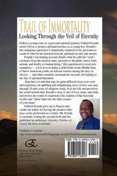 Follow a young man on a personal spiritual journey. Gabriel Ezutah meets Chiva, a modern spiritual traveler, as a young boy. Ezutah's life changing experience is beautifully rendered in his personal account of what he has learned from his spiritual traveler and master. Ezutah's fascinating account details what he calls his "soul's existence from the mineral state, upwards to the plant, insect, bird, animal, and finally, to human being." He experienced several reincarnations -- a lost love in India, a child bride in the Middle East, a Native American youth, an African warrior during the days of slavery -- and other countless incarnations on earth, all leading to the day of spiritual liberation. Step into a world that may be quite different from your own and experience an uplifting and enlightening story of how one man, through 20 plus years of religious study, lives his life and perceives the world around him. Ezutah's story is one of love, hope, and faith, and invites the reader to experience the realities of the heavenly worlds and "shine light into the dark corners of your heart." Gabriel Ezutah grew up in Nigeria and credits his father for having the greatest influence on his profession as a writer. Mr. Ezutah is currently writing his second book and has published an anthology of poetry, Pebbles of Sound. He lives in Ireland. Publisher's website: http://www.strategicpublishinggroup.com/title/TrailOfImmortality.html