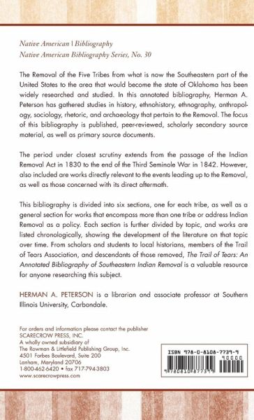 The Removal of the Five Tribes from what is now the Southeastern part of the United States to the area that would become the state of Oklahoma is a topic widely researched and studied. In this annotated bibliography, Herman A. Peterson has gathered together studies in history, ethnohistory, ethnography, anthropology, sociology, rhetoric, and archaeology that pertain to the Removal. The focus of this bibliography is on published, peer-reviewed, scholarly secondary source material and published primary source documents that are easily available. The period under closest scrutiny extends from the passage of the Indian Removal Act in 1830 to the end of the Third Seminole War in 1842. However, works directly relevant to the events leading up to the Removal, as well as those concerned with the direct aftermath of Removal in Indian Territory, are also included. This bibliography is divided into six sections, one for each of the tribes, as well as a general section for works that encompass more than one tribe or address Indian Removal as a policy. Each section is further divided by topic, and within each section the works are listed chronologically, showing the development of the literature on that topic over time. The Trail of Tears: An Annotated Bibliography of Southeastern Indian Removal is a valuable resource for anyone researching this subject.