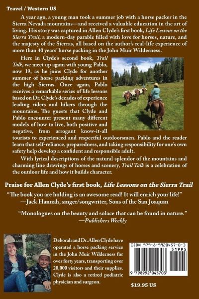 A year ago, a young man took a summer job with a horse packer in the Sierra Nevada mountains-and received a valuable education in the art of living. His story was captured in Allen Clyde's first book, Life Lessons on the Sierra Trail, a modern-day parable filled with love for horses, nature, and the majesty of the Sierras, all based on the author's real-life experience of more than 40 years' horse packing in the John Muir Wilderness. Here in Clyde's second book, Trail Talk, we meet up again with young Pablo, now 19, as he joins Clyde for another summer of horse packing adventures in the high Sierras. Once again, Pablo receives a remarkable series of life lessons based on Dr. Clyde's over 40 years' experience leading riders and hikers through the mountains. The guests that Clyde and Pablo encounter present many different models of how to live, both positive and negative, from arrogant know-it-all tourists to experienced and respectful outdoorsmen. Pablo and the reader learn that self-reliance, preparedness, and taking responsibility for one's own safety help develop a confident and responsible adult. With lyrical descriptions of the natural splendor of the mountains and charming line drawings of horses and scenery, Trail Talk is a celebration of the outdoor life and how it builds character.