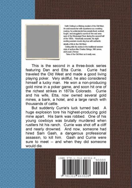 This is the second in a 3-novel series featuring Dan Currie, a gambler turned business man in an 1870s gold mining town high in the Colorado Rockies. Currie had always considered himself a lucky man. He'd won a non-producing gold mine in a poker game and soon hit one of the biggest strikes in Colorado. He and his wife, Etta, now owned several mines, a bank, a hotel, and a large ranch with thousands of cattle. But Currie's luck had suddenly turned bad. A huge explosion tore his highest producing gold mine apart. His bank was robbed. One of his young cowboys was brutally murdered when rustlers hit his ranch. Currie was shot off a cliff and nearly drowned. And now, someone had hired Sam Gash, a dangerous professional assassin to murder him. Lightening fast with a gun, Gash was also known to kill from ambush on occasion. One thing was certain. When Gash and Currie met, someone would surely die.