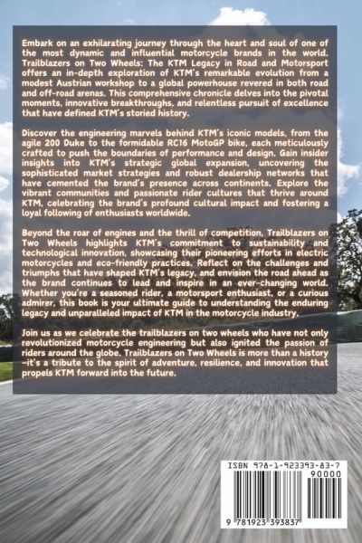 Embark on an exhilarating journey through the heart and soul of one of the most dynamic and influential motorcycle brands in the world. Trailblazers on Two Wheels: The KTM Legacy in Road and Motorsport offers an in-depth exploration of KTM's remarkable evolution from a modest Austrian workshop to a global powerhouse revered in both road and off-road arenas. This comprehensive chronicle delves into the pivotal moments, innovative breakthroughs, and relentless pursuit of excellence that have defined KTM's storied history. Discover the engineering marvels behind KTM's iconic models, from the agile 200 Duke to the formidable RC16 MotoGP bike, each meticulously crafted to push the boundaries of performance and design. Gain insider insights into KTM's strategic global expansion, uncovering the sophisticated market strategies and robust dealership networks that have cemented the brand's presence across continents. Explore the vibrant communities and passionate rider cultures that thrive around KTM, celebrating the brand's profound cultural impact and fostering a loyal following of enthusiasts worldwide. Beyond the roar of engines and the thrill of competition, Trailblazers on Two Wheels highlights KTM's commitment to sustainability and technological innovation, showcasing their pioneering efforts in electric motorcycles and eco-friendly practices. Reflect on the challenges and triumphs that have shaped KTM's legacy, and envision the road ahead as the brand continues to lead and inspire in an ever-changing world. Whether you're a seasoned rider, a motorsport enthusiast, or a curious admirer, this book is your ultimate guide to understanding the enduring legacy and unparalleled impact of KTM in the motorcycle industry. Join us as we celebrate the trailblazers on two wheels who have not only revolutionized motorcycle engineering but also ignited the passion of riders around the globe. Trailblazers on Two Wheels is more than a history-it's a tribute to the spirit of adventure, resilience, and innovation that propels KTM forward into the future.