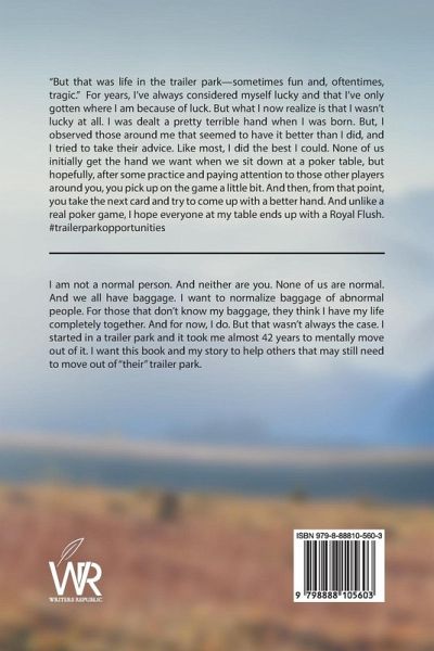 "But that was life in the trailer park-sometimes fun and, oftentimes, tragic." For years, I've always considered myself lucky and that I've only gotten where I am because of luck. But what I now realize is that I wasn't lucky at all. I was dealt a pretty terrible hand when I was born. But, I observed those around me that seemed to have it better than I did, andI tried to take their advice. Like most, I did the best I could. None of us initially get the hand we want when we sit down at a poker table, but hopefully, after some practice and paying attention to those other players around you, you pick up on the game a little bit. And then, from that point, you take the next card and try to come up with a better hand. And unlike a real poker game, I hope everyone at my table ends up with a Royal Flush.#trailerparkopportunities