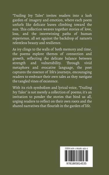 "Trailing Ivy Tales" invites readers into a lush garden of imagery and emotion, where each poem unfurls like delicate leaves climbing toward the sun. This collection weaves together stories of love, loss, and the intertwining paths of human experience, all set against the backdrop of nature's relentless beauty and resilience. As ivy clings to the walls of both memory and time, the poems explore themes of connection and growth, reflecting the delicate balance between strength and vulnerability. Through vivid metaphors and evocative language, the poet captures the essence of life's journeys, encouraging readers to embrace their own tales as they navigate the tangled vines of existence. With its rich symbolism and lyrical voice, "Trailing Ivy Tales" is not merely a collection of poems; it's an invitation to ponder the stories that bind us all, urging readers to reflect on their own roots and the shared narratives that flourish in the garden of life.
