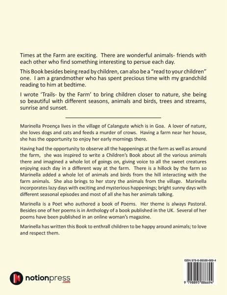 Times at the Farm are exciting. There are wonderful animals- friends with each other who find something interesting to pursue each day. This Book besides being read by children, can also be a "read to your children" one. I am a grandmother who has spent precious time with my grandchild reading to him at bedtime. I wrote 'Trails- by the Farm' to bring children closer to nature, she being so beautiful with different seasons, animals and birds, trees and streams, sunrise and sunset.