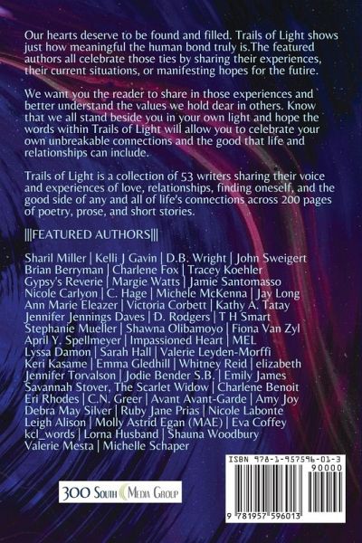 We look for love and understanding in so many different ways. Through friendship, family, love interests, and even our own self. Our hearts deserve to be found and filled. This collection shows just how meaningful the human bond truly is. The featured authors all celebrate those ties by sharing their experiences, their current situations, or manifesting hopes for the future. Trails of Light has over 200 pages of poetry, prose, and short stories encompassing the portrayed connections we have to others and ourselves, whether that's through love, companionship, mutual respect, hope, wants, or wishes. We want you the reader to share in those experiences and better understand the values we hold dear in others. Know that we all stand beside you in your own light and hope the words within Trails of Light will bring you to celebrate your own unbreakable connections and the good that life and relationships can include. Trails of Light is a collection of 53 writers sharing their voices and experiences of love, relationships, finding oneself, and the good side of any and all of life's connections. FEATURED AUTHORS Sharil Miller, Kelli J Gavin, D.B. Wright, John Sweigert, Brian Berryman, Charlene Fox, Tracey Koehler, Gypsy's Reverie, Margie Watts, Jamie Santomasso, Nicole Carlyon, C. Hage, Michele McKenna, Ann Marie Eleazer, Victoria Corbett, Kathy A. Tatay, Jennifer Jennings Daves, D. Rodgers, Stephanie Mueller, Shawna Olibamoyo, April Y. Spellmeyer, Impassioned Heart, MEL, Lyssa Damon, Sarah Hall, Valerie Leyden-Morffi, Keri Kasame, Emma Gledhill, Whitney Reid, T H Smart, Fiona Van Zyl, Jennifer Torvalson, Jay Long, Jodie Bender S.B., Emily James, Savannah Stover, The Scarlet Widow, Charlene Benoit, Eri Rhodes, C.N. Greer, Avant Avant-Garde, Amy Joy, Debra May Silver, Ruby Jane Prias, Nicole Labonte, Leigh Alison, Molly Astrid Egan (MAE), Eva Coffey, elizabeth, kcl_words, Lorna Husband, Shauna Woodbury, Valerie Mesta, Michelle Schaper