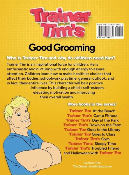 Trainer Tim is an inspirational force for children. He is enthusiastic and nurturing with enough energy to assure attention. Children learn how to make healthier choices that affect their bodies, schoolwork, playtime, general outlook, and in fact, their entire lives. This character will be a positive influence by building a child's self-esteem, elevating motivation, and improving their overall health. Books in the series include: Trainer Tim's Gym Trainer Tim's Camp Fitness Trainer Tim's Troubled Friend Trainer Tim's Down on the Farm Trainer Tim's Day at the Beach Trainer Tim's Day at the Park Trainer Tim Goes to the Library Trainer Tim Goes to Class Halloween with Trainer Tim Trainer Tim's Sleepy Time Trainer Tim's Good Grooming
