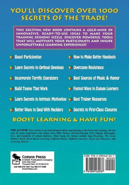 Do you wish to get sparks flying at your training sessions and achieve dramatically better results? Here's the book for you. Packed with more than 1,000 innovative and practical ideas, you'll discover how to motivate your participants and ensure an unforgettable learning experience. Open the pages of this book of reader-friendly lists and discover the secrets to training success! You'll learn how to: Boost participation Create first-class openings and closings Incorporate terrific energizers Build teams that work Raise intrinsic motivation Overcome resistance Engage learners Find the best training resources Make better handouts Deal with hecklers, and much more! This insightful book is easy to follow and written by a world-class presenter.