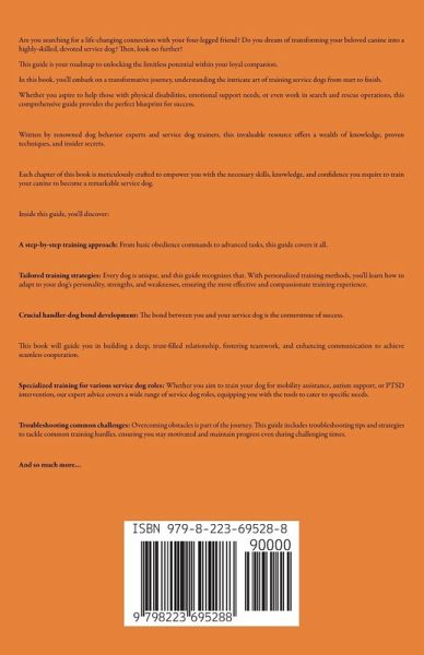 Are you searching for a life-changing connection with your four-legged friend? Do you dream of transforming your beloved canine into a highly-skilled, devoted service dog? Then, look no further! This guide is your roadmap to unlocking the limitless potential within your loyal companion. In this book, you'll embark on a transformative journey, understanding the intricate art of training service dogs from start to finish. Whether you aspire to help those with physical disabilities, emotional support needs, or even work in search and rescue operations, this comprehensive guide provides the perfect blueprint for success. Written by renowned dog behavior experts and service dog trainers, this invaluable resource offers a wealth of knowledge, proven techniques, and insider secrets. Each chapter of this book is meticulously crafted to empower you with the necessary skills, knowledge, and confidence you require to train your canine to become a remarkable service dog. Inside this guide, you'll discover: A step-by-step training approach: From basic obedience commands to advanced tasks, this guide covers it all. Tailored training strategies: Every dog is unique, and this guide recognizes that. With personalized training methods, you'll learn how to adapt to your dog's personality, strengths, and weaknesses, ensuring the most effective and compassionate training experience. Crucial handler-dog bond development: The bond between you and your service dog is the cornerstone of success. This book will guide you in building a deep, trust-filled relationship, fostering teamwork, and enhancing communication to achieve seamless cooperation. Specialized training for various service dog roles: Whether you aim to train your dog for mobility assistance, autism support, or PTSD intervention, our expert advice covers a wide range of service dog roles, equipping you with the tools to cater to specific needs. Troubleshooting common challenges: Overcoming obstacles is part of the journey. This guide includes troubleshooting tips and strategies to tackle common training hurdles, ensuring you stay motivated and maintain progress even during challenging times. And so much more... This guide is more than just a book; it's a life-changing opportunity to forge an unbreakable bond with your beloved companion. With each turn of the page, you'll be one step closer to unlocking your dog's extraordinary potential.