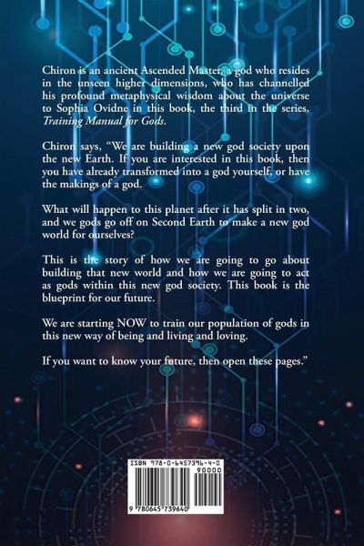 This is the third book in the series, Training Manual for Gods, which has been channelled by Sophia Ovidne from the ancient Ascended Master Chiron, a god who speaks to us from an unseen higher dimension, offering us his profound metaphysical wisdom about the universe and the future for humankind. Chiron builds upon the foundational knowledge presented in his previous two books in the series, but here he focuses on training those humans who have already become gods on Earth, or those well down the path to becoming one. He describes how new human-gods will need to operate in the fledgling all-god society that will be built on the new world of Second Earth. How will they need to manage the transition from old world to new, and what choices will they have to make when faced with the incidents that will lead to the Final Shift which will separate the dimensions of old Earth and new Earth? Chiron will help the new gods to develop their superpowers and godcraft, learning the ways of gods, and how they will need to act on Earth as they apply their god skills to the issues facing not only themselves but the entire planet, especially in the times immediately before and after the Final Shift. We are asked to consider how we would visualise a new god society on Earth, and then how we would bring it about, using our potent manifestation abilities as gods. This new human-god civilisation will be the work of ingenious minds over many years. Acolytes and ancient Masters will come together to build this new world, not only structurally, but with new kinds of governance, systems, organisations, functions, and technology, all bound within the dimensions of quantum physics, and founded upon the tenets of love, respect, and consideration. Chiron reveals to us many facets of our new future, and the wonderful strangeness of the unknown and unseen universe that will become our new home, but a home of peace and harmony, and a new, thrilling way of being, living, and loving.