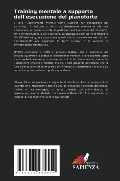 Il libro "L'allenamento mentale come supporto per l'esecuzione del pianoforte" è dedicato al tema dell'allenamento mentale e alla sua applicazione in campo musicale, in particolare nell'esecuzione del pianoforte. Offre un'introduzione a varie tecniche, caratterizzate dalle teorie di Klöppel e Orloff-Tschekorsky, e spiega come questi metodi possano essere utilizzati specificamente per migliorare la forza mentale e la capacità di concentrazione dei musicisti.Un'altra attenzione è rivolta ai processi biologici che si innescano nel cervello attraverso la pratica e l'allenamento mentale. Il libro esamina come questi metodi possano promuovere non solo la tecnica esecutiva, ma anche il benessere emotivo e mentale. Inoltre, il libro presenta un'indagine che fa luce sulle esperienze dei musicisti con i metodi di allenamento mentale e su come li integrano nella loro pratica quotidiana.