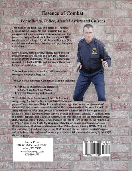 This book is the fifth level in a series of Training Mission Group levels. No one in history has ever amassed such a comprehensive encyclopedia on this collective body of hand, stick, knife and gun CQC combatives, all a forged hybrid from military, police, martial arts and medical, historical and psychological disciplines. Every citizen, martial artist, soldier, guard and cop must study Hock's courses and own these books. They provide information and insight available no where else. With all his experience, research, his books, DVDs and extensive international seminar schedule, Hock has become an institution. This book contains vital tactics, drills,scenarios, strategies and psychology on: . The Level Five Unarmed Combatives Module . SDMS Stick Disarming and Retention . The Saber Grip Stabbing Module . Long Gun Disarming and Retention W. Hock Hochheim has instructed the U.S. Marines, Army, Navy, Air Force, allied troops, SWAT teams and police officers from over 280 police academies and agencies as well as thousands of citizens and martial artists around the world. He is a commendated Texas police and U.S. Army military vet with three decades of experience, a former private investigator and a graduate of many academies, street survival courses and combat schools. With Black Belts in Filipino, Japanese and Hawaiian systems, Hock was inducted into the prestigious Black Belt Magazine Hall of Fame. He was awarded the title of Guro in Manila, the Philippines in 1993. Author of the Knife Fighting Encyclopedia series, and this Training Mission Series Hock has produced more than 200 acclaimed training videos and DVDs. With all this education, research and experience, Hock founded his international martial Congress, and he is the architect of several modern, practical martial courses culminating in this CQC Group program.