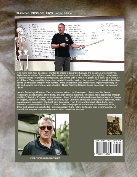 "For more than four decades I wanted to create a program that was the essence of combatives. Style-free. Arts-free. Sports-free. The essence of hand, stick, knife, and gun fighting. I envisioned a person skilled in unarmed combatives, yet armed with a rifle, or a pistol, or a stick, or a knife, or all of them. They could fight standing, seated, kneeling and on the ground. They could utilize their hands or whatever weapon was needed, while doing what was morally and legally necessary to win, survive the crime or war situation. These Training Mission books document my mission." - Hock Hock's Training Mission Two is an unarmed and multi-weapon collection of his Force Necessary, Level 2 hand, stick, knife, and gun course materials. The material is organized through his Stop 6 training Program as it's skeleton. Stop 2 is all the vital collisions that spring from fingers on fingers, hands on hands, hands on wrists, both unarmed and grabs on weapons.