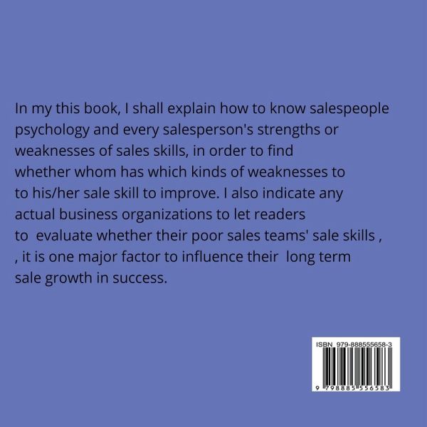 In my this book, I shall explain how to know salespeople psychology and every salesperson's strengths or weaknesses of sales skills, in order to find whether whom has which kinds of weaknesses to his/her sale skill to improve. I also indicate any actual business organizations to let readers to evaluate whether their poor sales teams' sale skills , it is one major factor to influence their long term sale growth in success.
