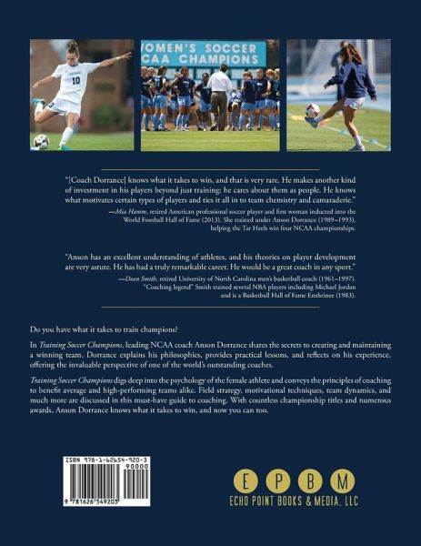 "[Coach Dorrance] knows what it takes to win, and that is very rare. He makes another kind of investment in his players beyond just training: he cares about them as people. He knows what motivates certain types of players and ties it all in to team chemistry and camaraderie." -Mia Hamm, retired American professional soccer player and first woman inducted into the World Football Hall of Fame (2013). She trained under Anson Dorrance (1989-1993),helping the Tar Heels win four NCAA championships. "Anson has an excellent understanding of athletes, and his theories on player development are very astute. He has had a truly remarkable career. He would be a great coach in any sport." -Dean Smith, retired University of North Carolina men's basketball coach (1961-1997)."Coaching legend" Smith trained several NBA players including Michael Jordan and is a Basketball Hall of Fame Enshrinee (1983). Do you have what it takes to train champions? In Training Soccer Champions, leading NCAA coach Anson Dorrance shares the secrets to creating and maintaining a winning team. Dorrance explains his philosophies, provides practical lessons, and reflects on his experience, offering the invaluable perspective of one of the world's outstanding coaches. Training Soccer Champions digs deep into the psychology of the female athlete and conveys the principles of coaching to benefit average and high-performing teams alike. Field strategy, motivational techniques, team dynamics, and much more are discussed in this must-have guide to coaching. With countless championship titles and numerous awards, Anson Dorrance knows what it takes to win, and now you can too.