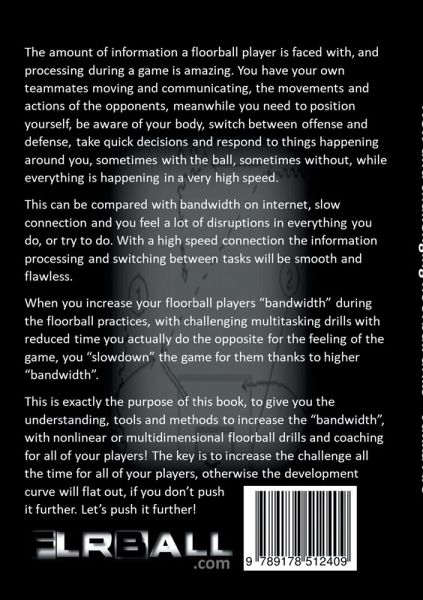 The amount of information a floorball player is faced with, and processing during a game is amazing. You have your own teammates moving and communicating, the movements and actions of the opponents, meanwhile you need to position yourself, be aware of your body, switch between offense and defense, take quick decisions and respond to things happening around you, sometimes with the ball, sometimes without, while everything is happening in a very high speed.This can be compared with bandwidth on internet, slow connection and you feel a lot of disruptions in everything you do, or try to do. With a high speed connection the information processing and switching between tasks will be smooth and flawless.When you increase your floorball players "bandwidth" during the floorball practices, with challenging multitasking drills with reduced time you actually do the opposite for the feeling of the game, you slowdown the game for them thanks to higher "bandwidth".This is exactly the purpose ofthis book, to give you the understanding, tools and methods to increase the "bandwidth", with nonlinear or multidimensional floorball drills and coaching for all of your players. The key is to increase the challenge all the time for all of your players, otherwise the development curve will flat out, if you don't push it further. Let's push it further!