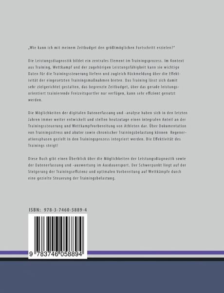 Dieser Band gibt einen Überblick über die Möglichkeiten der Leistungsdiagnostik, der Trainingsgestaltung sowie der Datenerfassung und -auswertung im Ausdauersport. Der Schwerpunkt liegt auf der Steigerung der Trainingseffizienz und optimalen Vorbereitung auf Wettkämpfe durch eine gezielte Steuerung der Trainingsbelastung:Wie kann ich mit meinem Zeitbudget den größtmöglichen Fortschritt erzielen?Die Leistungsdiagnostik bildet ein zentrales Element im Trainingsprozess. Im Kontext aus Training, Wettkampf und der zugehörigen Leistungsfähigkeit kann sie wichtige Daten für die Trainingssteuerung liefern und zugleich Rückmeldung über die Effektivität der eingesetzten Trainingsmaßnahmen bieten. Das Training lässt sich damit sehr zielgerichtet gestalten.Die Möglichkeiten der digitalen Datenerfassung und -analyse haben sich in den letzten Jahren immer weiter entwickelt und stellen heutzutage einen integralen Anteil an der Trainingssteuerung und Wettkampfvorbereitung von Athleten dar. ÜberDokumentation von Trainingsstress und akuter sowie chronischer Trainingsbelastung können Regenerationsphasen gezielt in den Trainingsprozess integriert werden. Die Effektivität des Trainings steigt!Im letzten Kapitel stellen wir einige konkrete Trainingseinheiten zu unterschiedlichen Trainingszielen vor. Sie stellen die Grundlage für die Entwicklung spezifischer Trainingsparameter dar, dienen als Anregung für das eigene Training und können entsprechend den individuellen Ansprüchen auch angepasst werden.