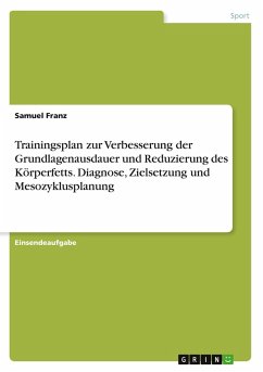Einsendeaufgabe aus dem Jahr 2020 im Fachbereich Sport - Bewegungs- und Trainingslehre, Note: 2,3, Deutsche Hochschule für Prävention und Gesundheitsmanagement GmbH, Veranstaltung: Trainingslehre II, Sprache: Deutsch, Abstract: Die vorliegende Arbeit beinhaltet eine ausführliche Diagnose des Gesundheits- und Leistungsstatus eines sportlich aktiven Kunden sowie die Planung eines Mesozyklus für dessen individuelles Training. Schwerpunkt der Arbeit liegt auf der Leistungsdiagnostik, der Trainingsplanung und der Optimierung der Ausdauer, Fettstoffwechsel und Herz-Kreislauf-Funktionen. Ziel ist die Verbesserung der Grundlagenausdauer und Reduzierung des Körperfetts durch einen gezielten Trainingsplan.