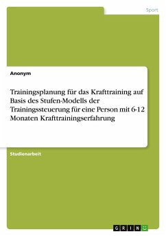 Studienarbeit aus dem Jahr 2023 im Fachbereich Sport - Bewegungs- und Trainingslehre, Note: 1,0, Deutsche Hochschule für Prävention und Gesundheitsmanagement GmbH, Veranstaltung: Trainingslehre 1, Sprache: Deutsch, Abstract: Diese Hausarbeit im Rahmen des Studiengangs "Bachelor Fitnessökonomie" an der DHfPG liefert eine fundierte, praxisorientierte Trainingsplanung über sechs Monate für eine Person mit mittlerer Krafttrainingserfahrung (6-12 Monate). Auf Basis des Stufenmodells der Trainingssteuerung wird ein vollständiger Makro- und Mesozyklus entwickelt - inklusive Kraftdiagnostik nach der ILB-Methode, individueller Zielsetzung (Kraftsteigerung, Muskelaufbau, Fettreduktion) sowie detaillierter Übungs- und Intensitätsplanung. Alle Trainingsmethoden, Belastungsparameter und Organisationsformen werden systematisch begründet. Ergänzt wird die Arbeit durch eine Literaturrecherche zu den Effekten von Krafttraining bei Diabetes Typ 2.