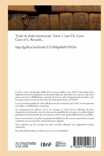 Traité de droit commercial. Tome 1 / par Ch. Lyon-Caen et L. Renault, ... Date de l'édition originale: 1906-1916 Le présent ouvrage s'inscrit dans une politique de conservation patrimoniale des ouvrages de la littérature Française mise en place avec la BNF. HACHETTE LIVRE et la BNF proposent ainsi un catalogue de titres indisponibles, la BNF ayant numérisé ces oeuvres et HACHETTE LIVRE les imprimant à la demande. Certains de ces ouvrages reflètent des courants de pensée caractéristiques de leur époque, mais qui seraient aujourd'hui jugés condamnables. Ils n'en appartiennent pas moins à l'histoire des idées en France et sont susceptibles de présenter un intérêt scientifique ou historique. Le sens de notre démarche éditoriale consiste ainsi à permettre l'accès à ces oeuvres sans pour autant que nous en cautionnions en aucune façon le contenu. Pour plus d'informations, rendez-vous sur www.hachettebnf.fr
