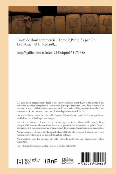 Traité de droit commercial. Tome 2, Partie 2 / par Ch. Lyon-Caen et L. Renault, ... Date de l'édition originale: 1906-1916 Le présent ouvrage s'inscrit dans une politique de conservation patrimoniale des ouvrages de la littérature Française mise en place avec la BNF. HACHETTE LIVRE et la BNF proposent ainsi un catalogue de titres indisponibles, la BNF ayant numérisé ces oeuvres et HACHETTE LIVRE les imprimant à la demande. Certains de ces ouvrages reflètent des courants de pensée caractéristiques de leur époque, mais qui seraient aujourd'hui jugés condamnables. Ils n'en appartiennent pas moins à l'histoire des idées en France et sont susceptibles de présenter un intérêt scientifique ou historique. Le sens de notre démarche éditoriale consiste ainsi à permettre l'accès à ces oeuvres sans pour autant que nous en cautionnions en aucune façon le contenu. Pour plus d'informations, rendez-vous sur www.hachettebnf.fr