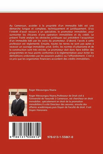 Au Cameroun, accéder à la propriété d'un immeuble bâti est une démarche longue et complexe, techniquement et juridiquement. D'où l'intérêt d'avoir recours à un spécialiste, le promteur immobilier, pour surmonter les chicanes d'une opération immobilière et du crédit. Le présent Traité analyse les obstacles juridiques qui précèdent l'acquisition d'un immeuble bâti par les soins du promoteur. D'abord, l'accès à cette profession est réglementé. Ensuite, toutes les terres ne sont pas aptes à recevoir un ouvrage immobilier privé. Enfin, les normes d'urbanisme et de la construction sont très strictes. Le promoteur doit donc faire édifier des programmes en tous points conformes à la réglementation pour éviter les démolitions ordonnées par les pouvoirs publics ou l'effondrement. C'est à ce prix que les organismes financiers accordent des crédits immobiliers.