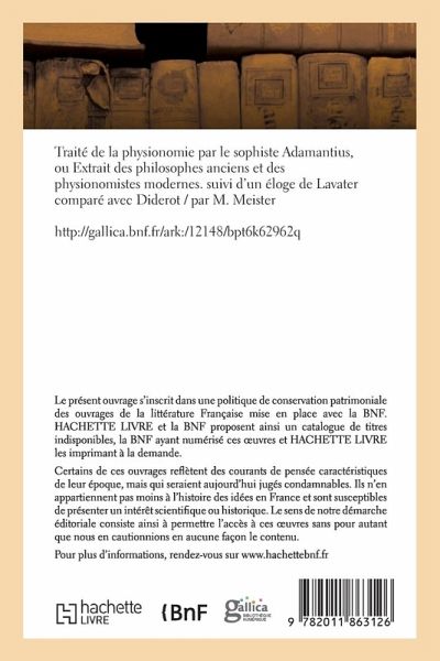 Traite de la physionomie par le sophiste Adamantius, ou Extrait des philosophes anciens et des physionomistes modernes. suivi d'un eloge de Lavater compare avec Diderot / par M. MeisterComprend: eloge de Lavater compare avec DiderotCe livre est la reproduction fidele d'une oeuvre publiee avant 1920 et fait partie d'un projet propose par la Bibliotheque nationale de France (BnF), offrant l'opportunite pour les lecteurs, enseignants ou chercheurs d'acceder a des ouvrages anciens et souvent rares issus de ses fonds patrimoniaux.Les oeuvres de cette collection appartiennent au domaine public . Elles ont ete numerisees par la BnF et sont presentes sur Gallica, la bibliotheque numerique de la BnF.En entreprenant de redonner vie a ces oeuvres au travers d'une collection de livres reimprimes a la demande, nous offrons la possibilite a ces oeuvres de rencontrer un public elargi et participons a la transmission de connaissances et de savoirs difficilement accessibles par ailleurs.Sur un plan technique, nous avons cherche a concilier la reproduction fidele d'un livre ancien a partir de sa version numerisee avec le souci d'un confort de lecture optimal. Nous esperons que les ouvrages de cette nouvelle collection vous apporteront entiere satisfaction.http: //gallica.bnf.fr/ark: /12148/bpt6k62962q